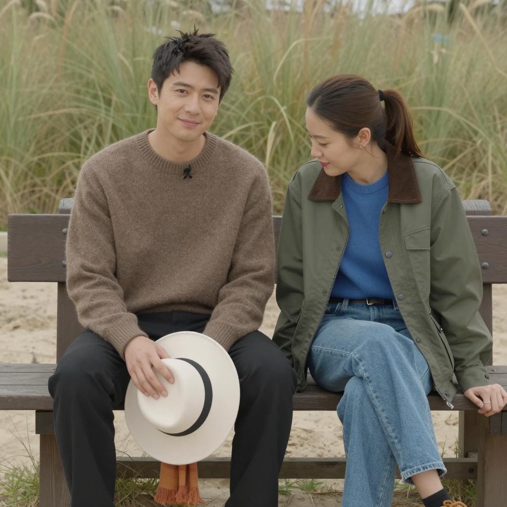 An Asian man and woman sitting side by side on a wooden bench in a grassy, sandy area. The man wears a brown sweater and black pants, holding a white hat and orange scarf, smiling slightly. The woman has brown hair in a ponytail and is dressed in a green jacket over a blue sweater with blue jeans, looking downward. Tall grass is visible in the background.