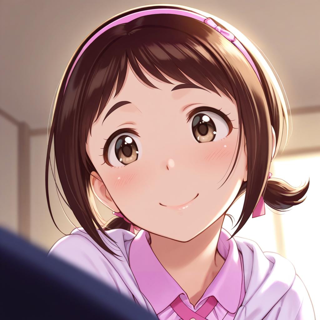 Muramatsu sakura, idolmaster, 1girl, pink eyes, brown eyes, eyebrows, brown hair, short twintails, hairband, by artist uyama hajime, illustrious