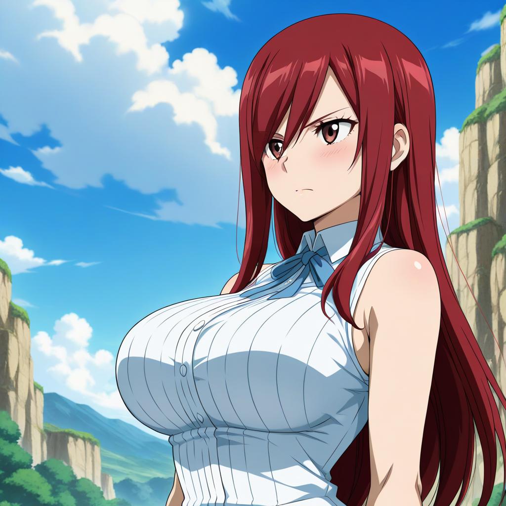 Erza, fairy tail, anime art style, 1girl, solo, long_hair, breasts, large_breasts, shirt, ribbon, brown_eyes, upper_body, red_hair, outdoors, sky, sleeveless, day, cloud, blue_sky, frown, serious