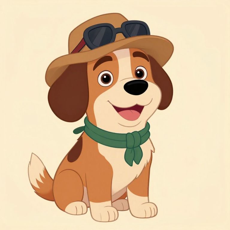 Cute cartoon puppy with brown and white fur, wearing a brown hat with sunglasses, green scarf, and smiling happily.