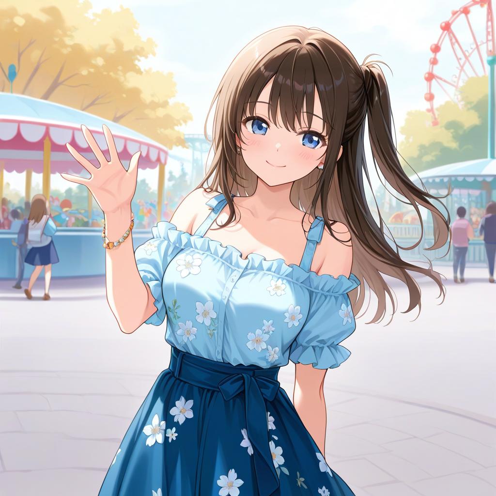 Masterpiece, best quality, highres, chi1, 1girl, long hair, one side up, solo, bracelet, bangs, bare shoulders, blue shirt, floral print, short sleeves, off-shoulder shirt, frills, blue skirt, amusement park, waving, smile