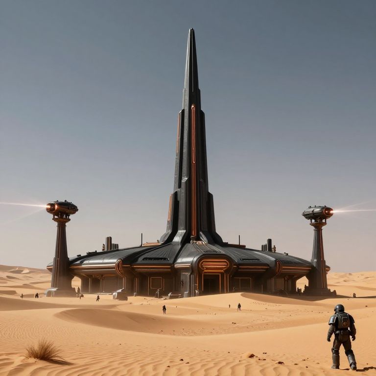 CGI image of a futuristic, towering, black spaceship-like structure with two observation towers in a bright, sandy desert under a clear blue sky. A