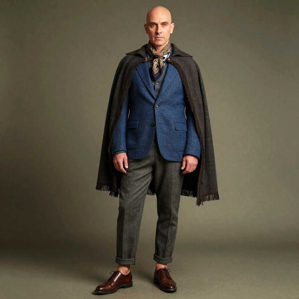 A bald man stands confidently dressed in layered old-style costume pieces, featuring a textured blue blazer, rolled-up gray trousers, and polished brown shoes. He accessorizes with a patterned scarf and a dark, fringed cloak draped over his shoulders, evoking a vintage or theatrical style.