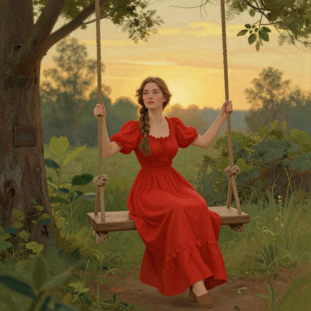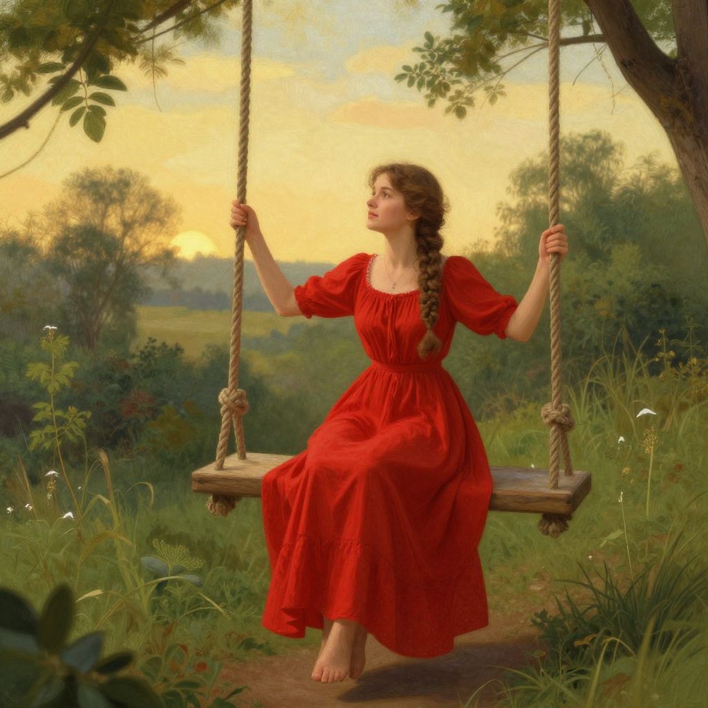 A serene digital illustration portrays a woman in a flowing red dress gracefully seated on a rustic wooden swing suspended by thick ropes, set against a tranquil backdrop of golden-hour lighting and lush greenery, evoking a vintage, romantic ambiance reminiscent of classic Russian pamphlet artwork.