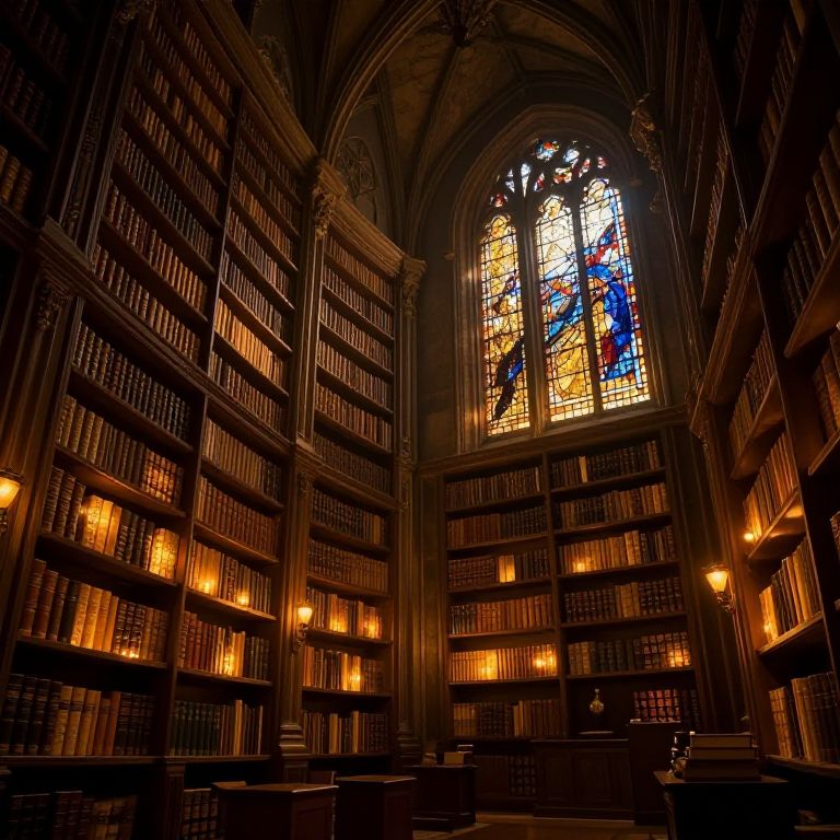 Photograph of a dimly lit, Gothic-style library with towering shelves of books, illuminated by warm light, and a large, colorful stained glass window