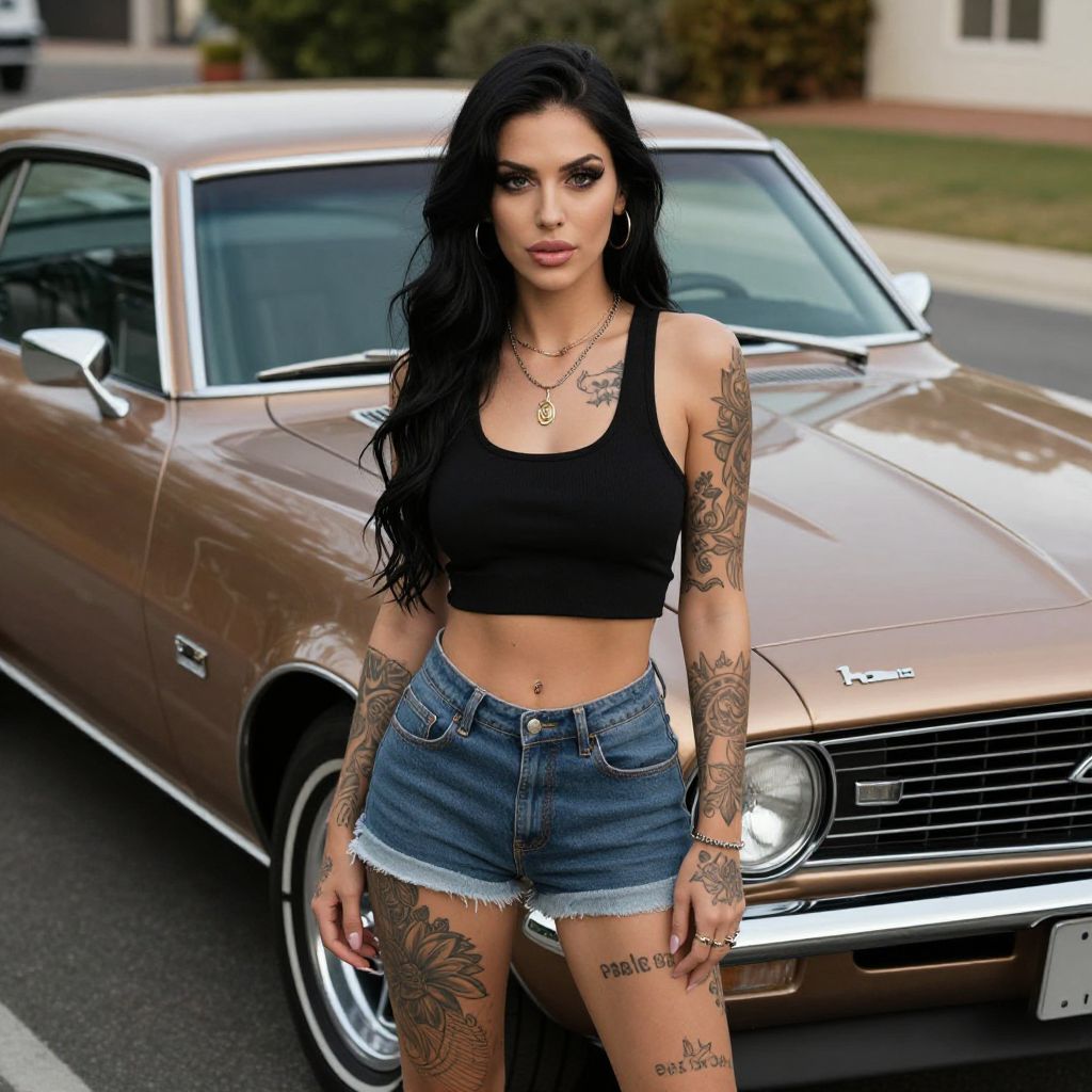 Photograph of a tattooed woman with long black hair, wearing a black crop top and high-waisted denim shorts, standing in front of a brown vintage Pontiac car. She has multiple tattoos on her arms, chest, and legs, and is wearing gold hoop earrings and multiple necklaces. The car's chrome grille and headlights are visible, with a blurred suburban background. Her expression is neutral, and the image has a sharp, vibrant color palette, highlighting her tan skin and the car's glossy finish.