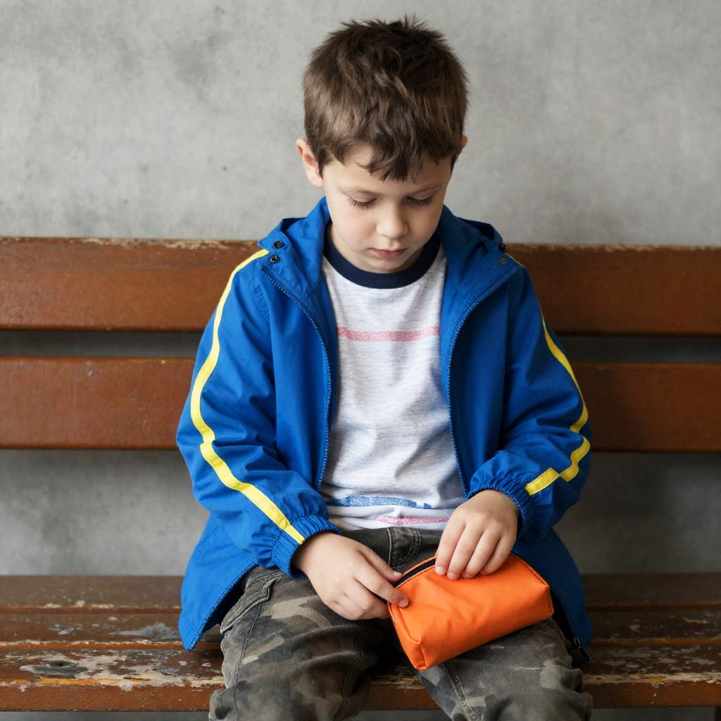 Young boy with short hair, crouching on dirty, worn stairs, covering face with hands. Wearing dark jacket, camouflage pants, black sneakers. Orange backpack on floor to the left. Rusty, peeling paint on walls. Dim, shadowy lighting. Dark doorway on right.