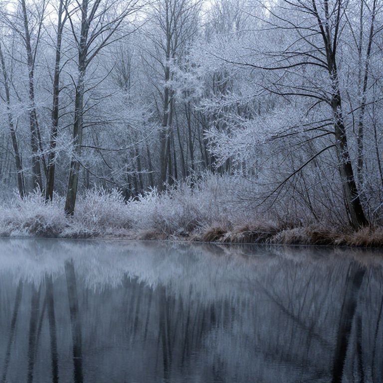 Serenity whispers through the frost-kissed forest, where still waters mirror the quiet resilience of nature, inviting contemplation amidst the eternal dance of life and silence.