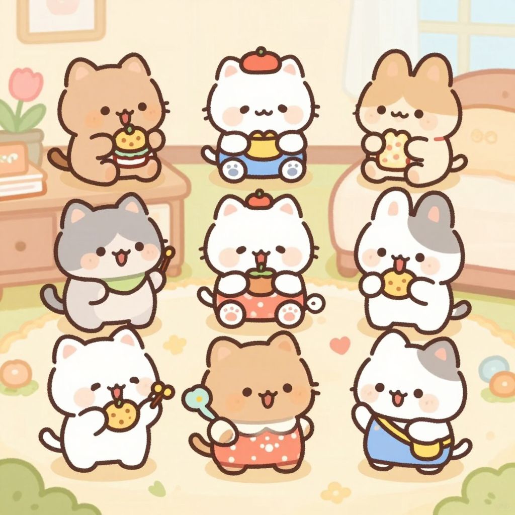 Adorable digital drawing of nine chibi-style cats, each holding a burger, wearing colorful clothes, in a bright, pastel-colored room.