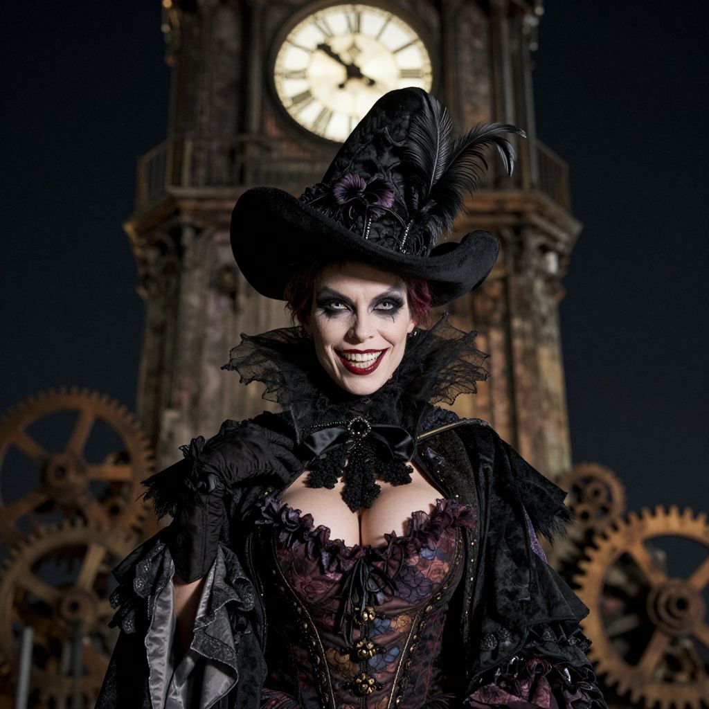 Photograph of a pale-skinned woman with dark makeup, wearing a black, gothic-style lace corset with frilled edges and a large, black, feathered hat. Her red lipstick contrasts with her dark eye makeup. Behind her, a large, illuminated clock with Roman numerals and intricate gears are visible against a dark, night-time background. The clock and gears are aged, adding a steampunk element to the scene. The woman's confident smile and elaborate outfit suggest a Victorian-inspired, fantasy or cosplay theme. The lighting emphasizes her face and outfit, creating a dramatic, high-contrast effect.