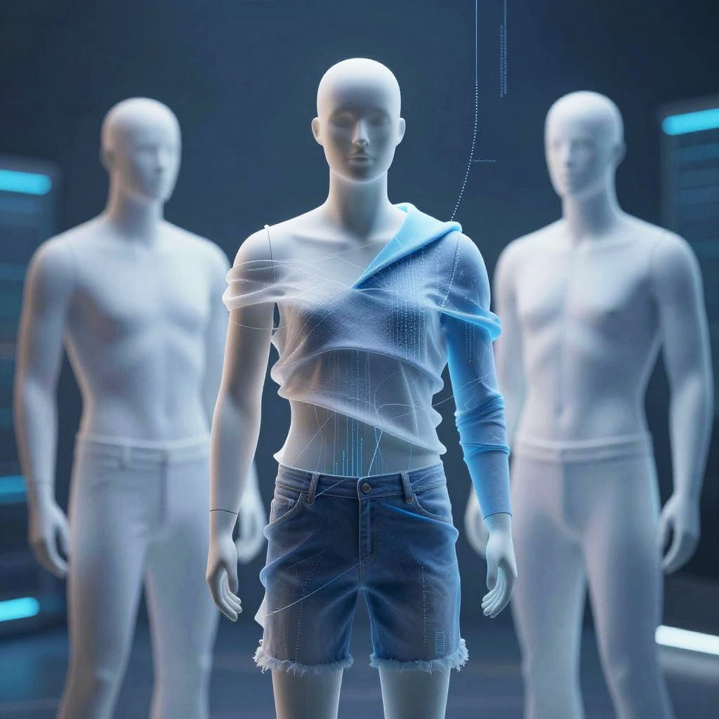 Remove clothes AI free visualization, abstract representation of AI algorithms gently removing clothing layers from digital mannequins, soft glowing effects, blend of blue and white tones, high-tech data streams, futuristic virtual environment