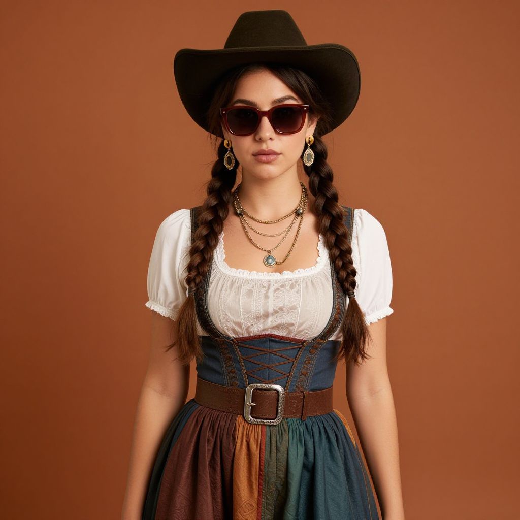 Derby outfit woman costume, 1girl, solo, braid, twin braids, hat, earrings, long hair, jewelry, dress, realistic, brown hair, belt, looking at viewer, sunglasses, brown background