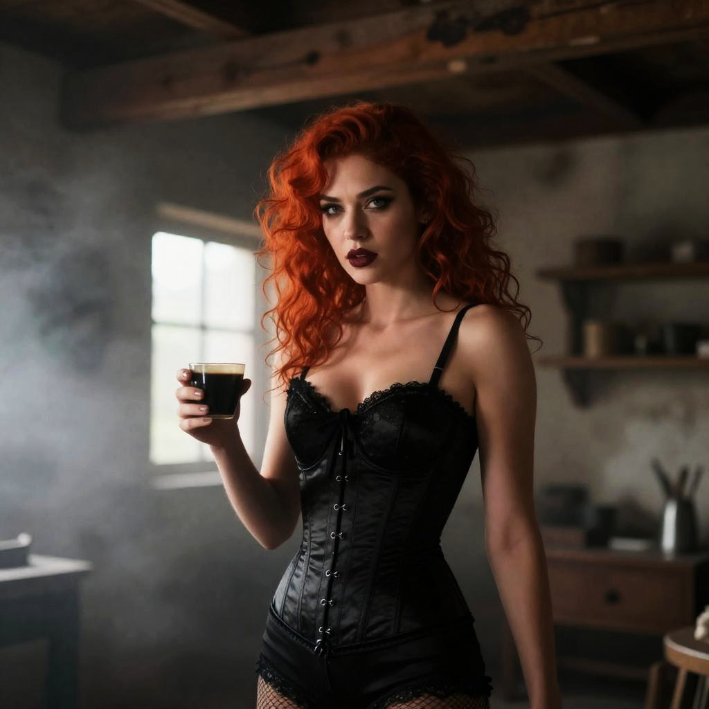 Portrait of a woman with vibrant red curly hair and dramatic dark makeup wearing a black lace corset and matching shorts. She holds a small cup of espresso in her left hand, standing in a dimly lit rustic room featuring wooden beams, a small window, and smoky atmosphere. The scene has a moody and intense ambiance with blurred shelves in the background.