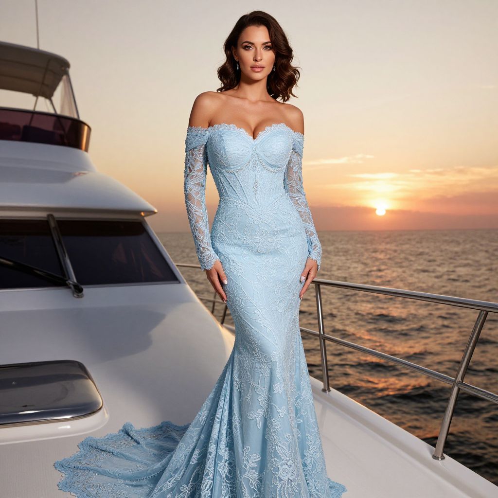 A Petite woman, romantic elegance, off-the-shoulder lace gown in pale blue, sweetheart neckline, long sleeves, body-hugging silhouette with mermaid skirt, floral lace overlay with beaded accents, scalloped edges, train at the back, soft curls, minimal jewelry, on a sunset cruise on a yacht. High fashion, glamorous lighting, polished finish Sexy. Pretty face and beаutiful eyes. Big breasts