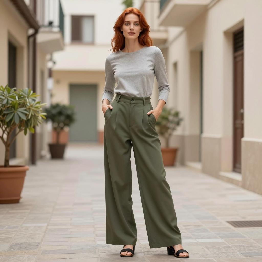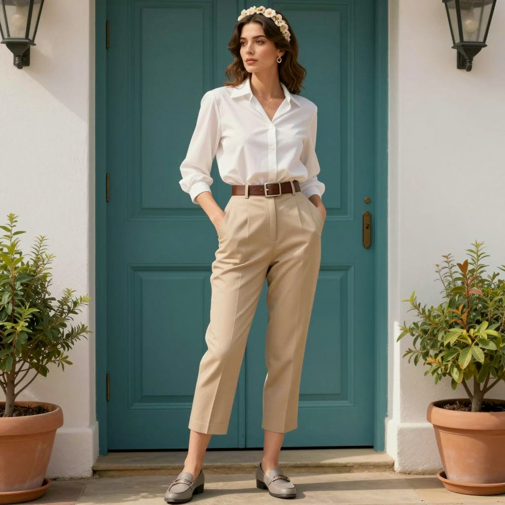 Photograph of a woman with light skin, wearing a wide-brimmed straw hat, dark sunglasses, large green teardrop earrings, white short-sleeved blouse, and high-waisted green pants with white diamond patterns. She has her right hand in her pants pocket, standing on a stone pathway between white-washed buildings. Bright daylight, clear blue sky, no visible expression. Website on the left.