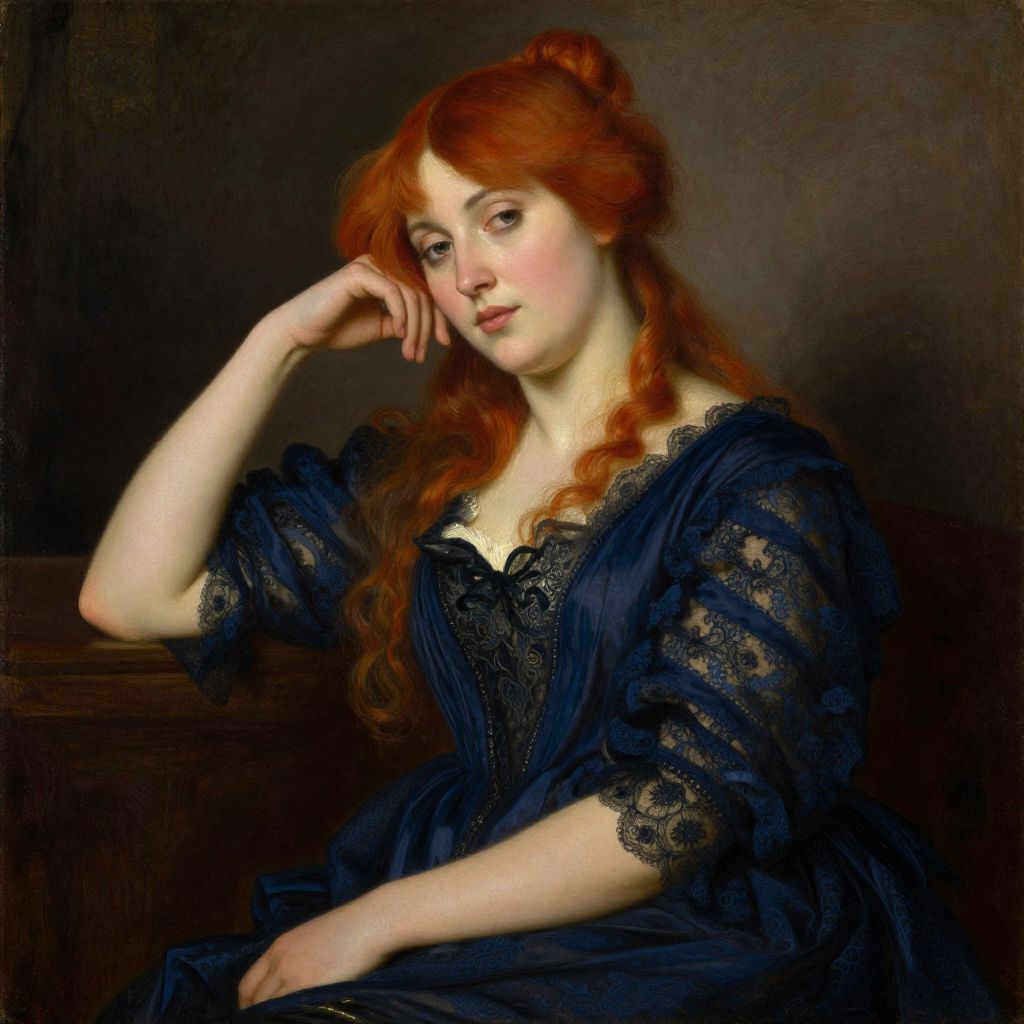 Photorealistic painting of a fair-skinned, red-haired woman with delicate features, wearing a dark blue lace dress, softly touching her cheek against a