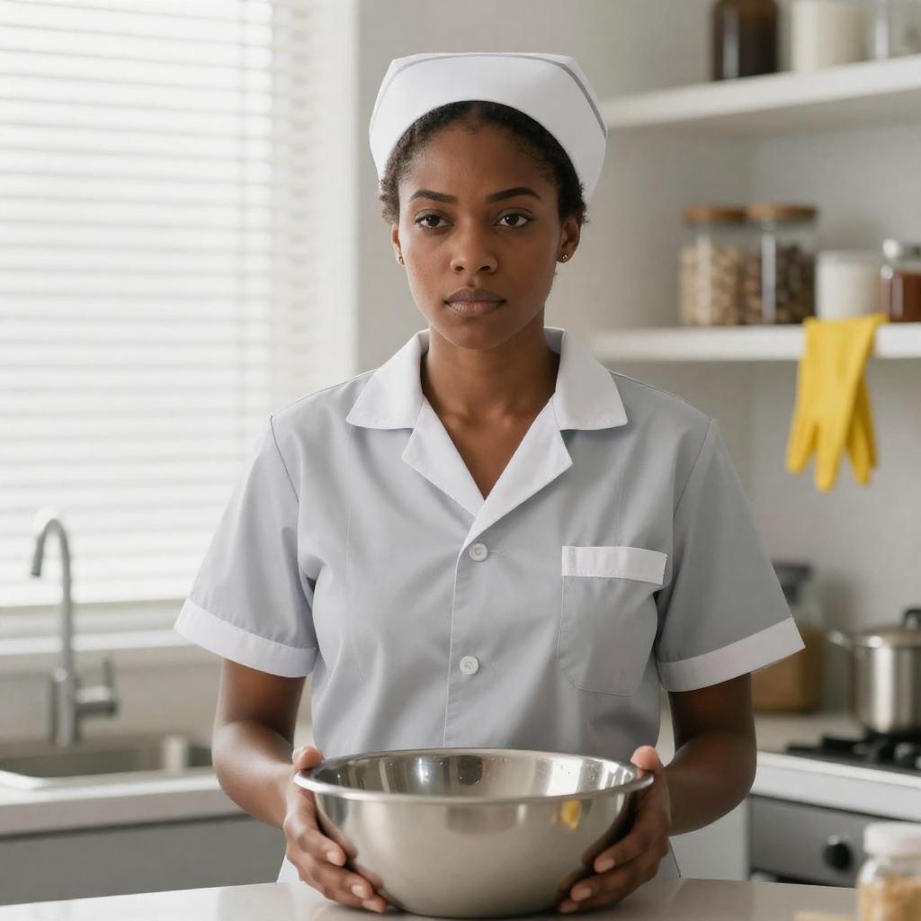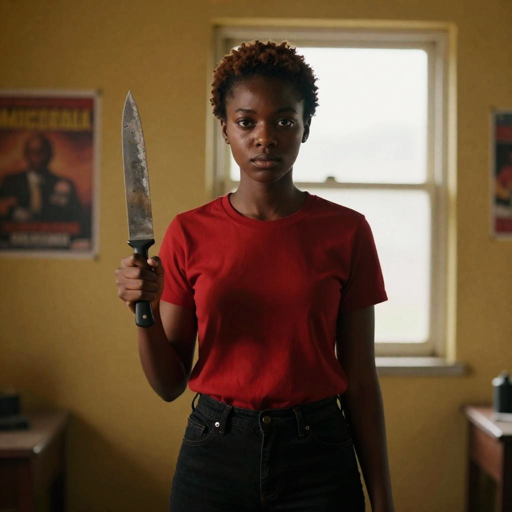 Photograph of a young Black woman with short, curly brown hair, wearing a red ured shirt and black pants, holding a large, dirty knife in her right hand. She stands in a dimly lit room with yellow walls and a window with white frames in the background. Her expression is serious and focused. The room has posters on the left wall.