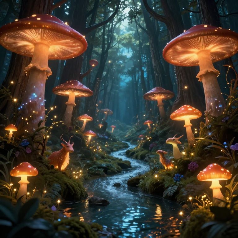 Fantasie scene of an ancient enchanted forest with towering glowing mushrooms, mythical animals, twinkling fairy lights, and a sparkling river winding through, rendered in intricate fantasy style with rich colors.