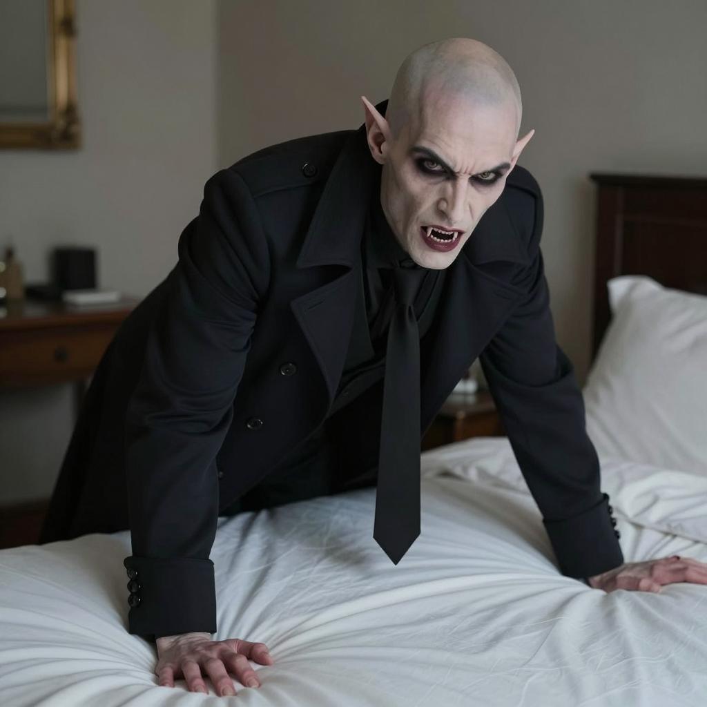 Creepy humanoid monster with bald head, pale skin, and long claws. Wearing dark, buttoned coat. Red background. Stands upright with arms slightly forward. Sharp teeth visible in open mouth. Monstrous, sinister expression. Plain red background.
