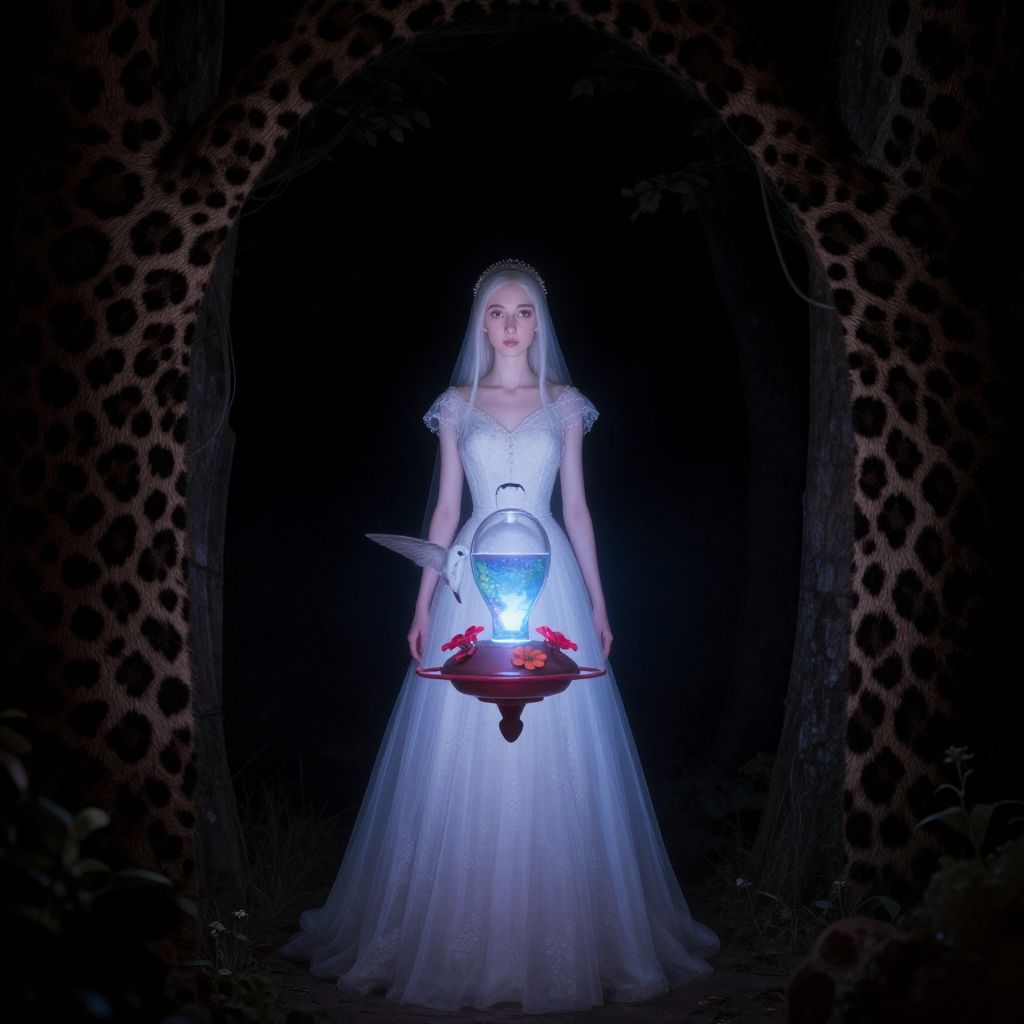 In the vein of surrealist art, envision an enchanting scene where a young woman in Renaissance attire stands amid a fantastical forest of towering mushrooms, their caps resembling ancient trees. Intricately detailed and hyperrealistic, she holds an hourglass with delicate precision, as its sand trickles onto a plush carpet of vivid flowers. Her face remains shrouded by the cascading grains, sparking curiosity about her identity. Warm golden light from the setting sun casts elongating shadows through the swirling hues created by interlocking petals and mushroom caps, evoking a sense of wonder and timeless intrigue in this captivating fusion of fantasy and surrealism.
