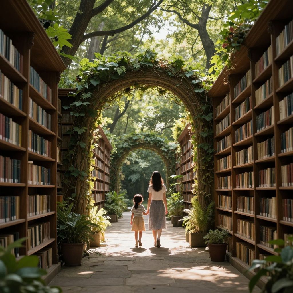 Photograph of a sunlit library aisle with an arched trellis covered in green ivy, flanked by tall wooden bookshelves filled with books. A woman with long brown hair, wearing a white top and gray skirt, and a young girl in a yellow dress and white shoes, hold hands as they walk away from the camera, towards the bright, tree-filled background. Potted plants are on either side of the aisle, adding to the lush, serene atmosphere. Sunlight filters through the leaves, creating dappled light patterns on the stone floor.