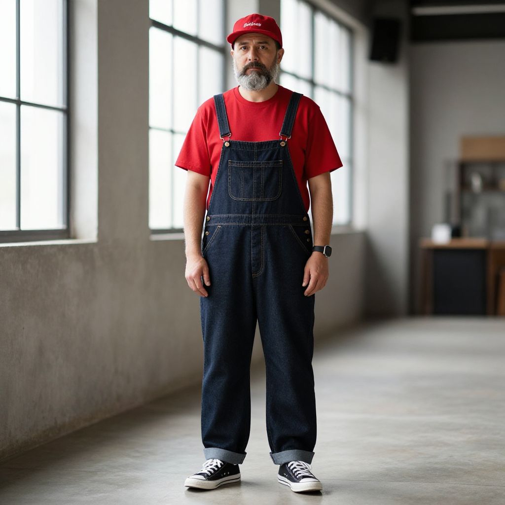 A man with a gray beard stands confidently in a stylish indoor setting, wearing a red cap, red t-shirt, and dark denim overalls paired with black sneakers. The natural light from tall windows highlights his casual yet put-together look, giving the photo a contemporary lifestyle vibe.