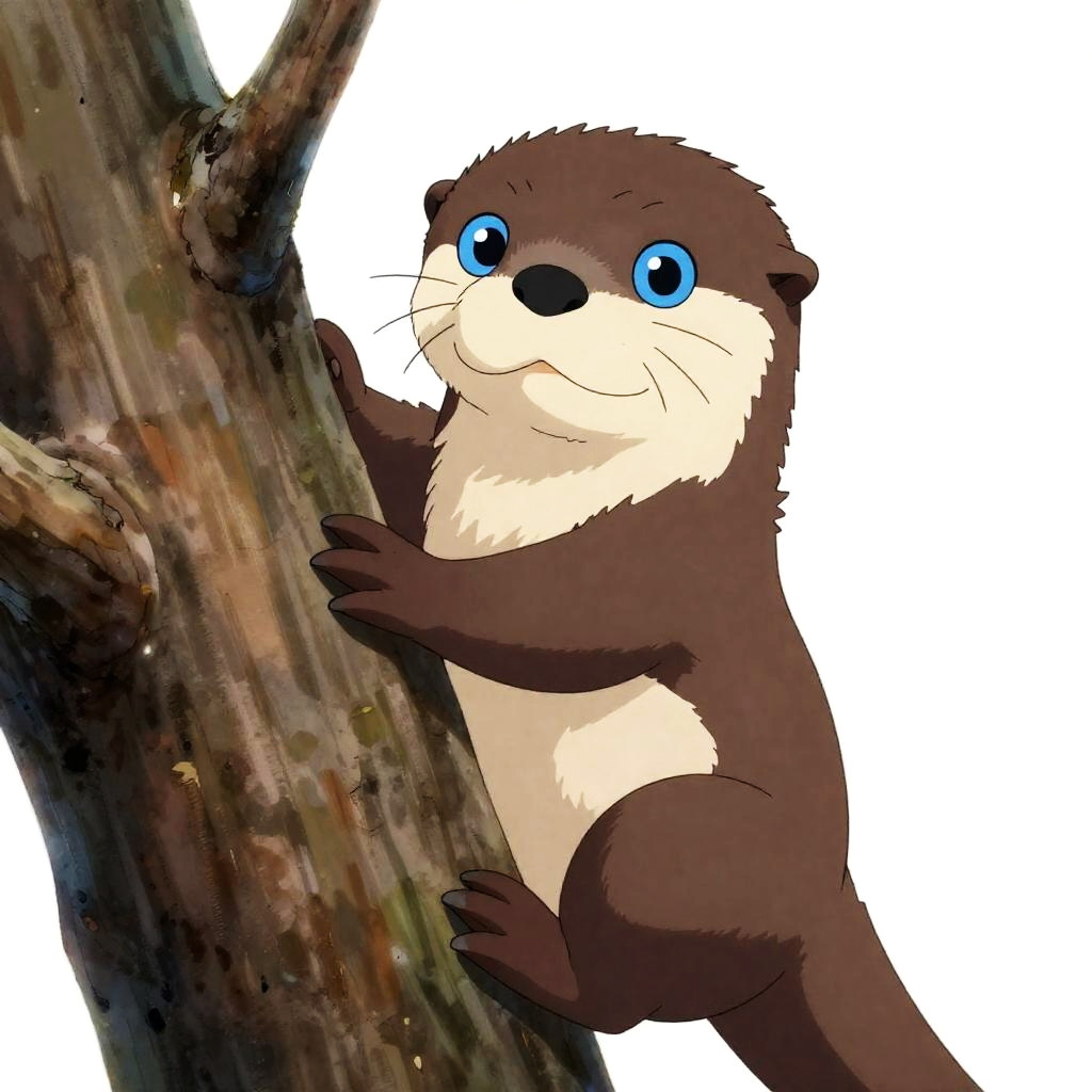 An otter depicted in a cel-shaded anime, showcasing webbed paws. Dressed in sporty attire, it displays a focused look while climbing a tree. Its bright blue eyes are wide open, illustrated as a complete character on a transparent background, embodying the playful essence of Ghibli-inspired cartoons.