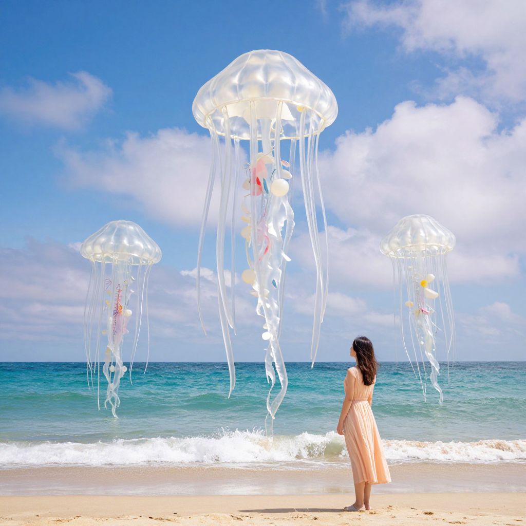 Jellyfish-like sculptures emerge from the ocean, their translucent forms towering over a woman in a peach dress as she stands on a sandy beach under a vibrant sky dotted with fluffy clouds.
