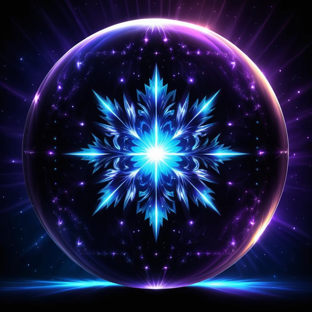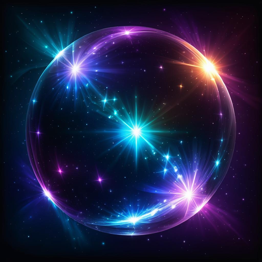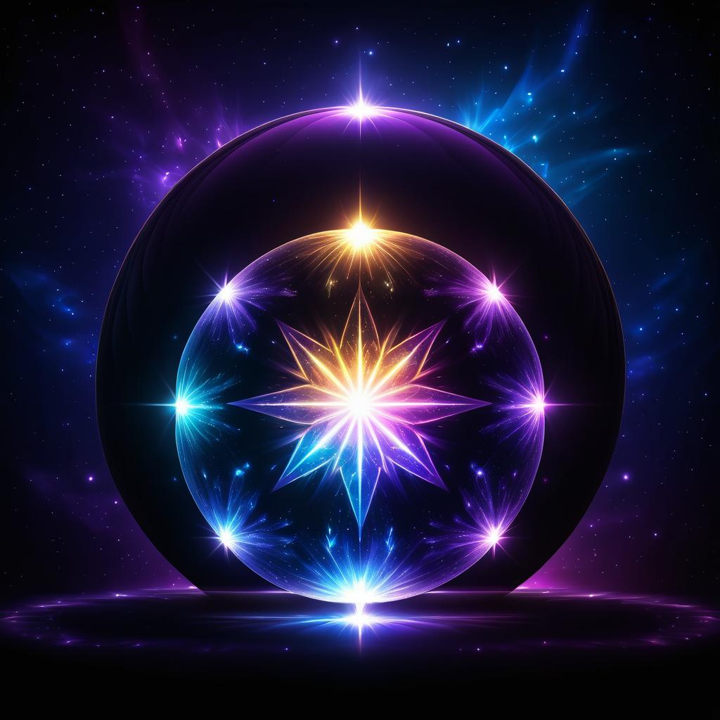 A vibrant celestial crystal orb emitting intense glowing effects with bright purple, blue, and golden hues. The orb features radiant star-like patterns and is set against a dark cosmic background filled with subtle starry details.