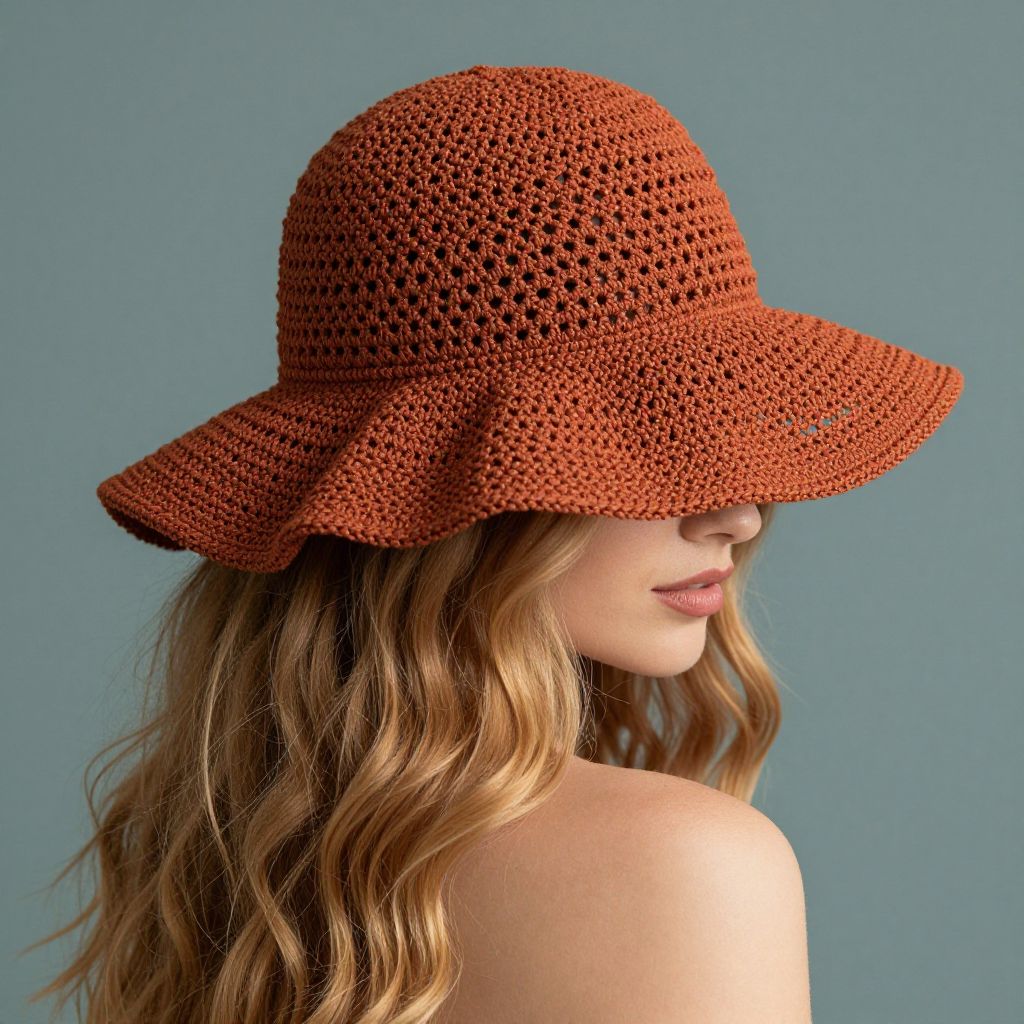 Woman wearing a rust-colored crochet-textured sunhat with wide brim, featuring wavy blonde hair cascading over her shoulders against a muted teal background.