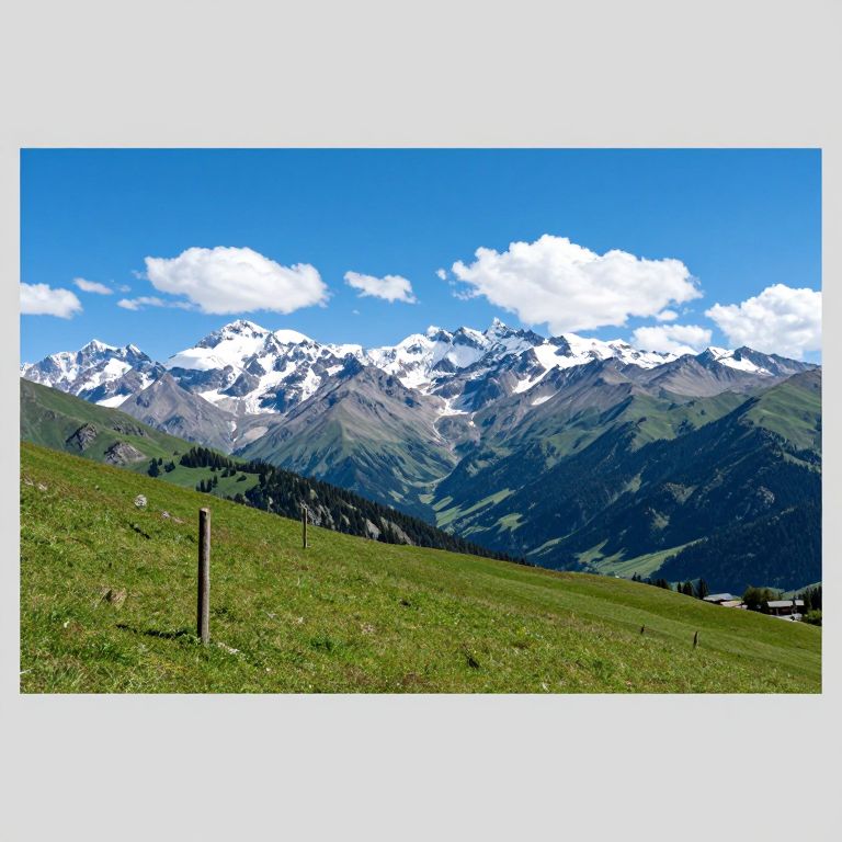 Photograph of a vibrant mountain landscape with snow-capped peaks, bright blue sky, scattered clouds, and a grassy hill with a simple wire fence