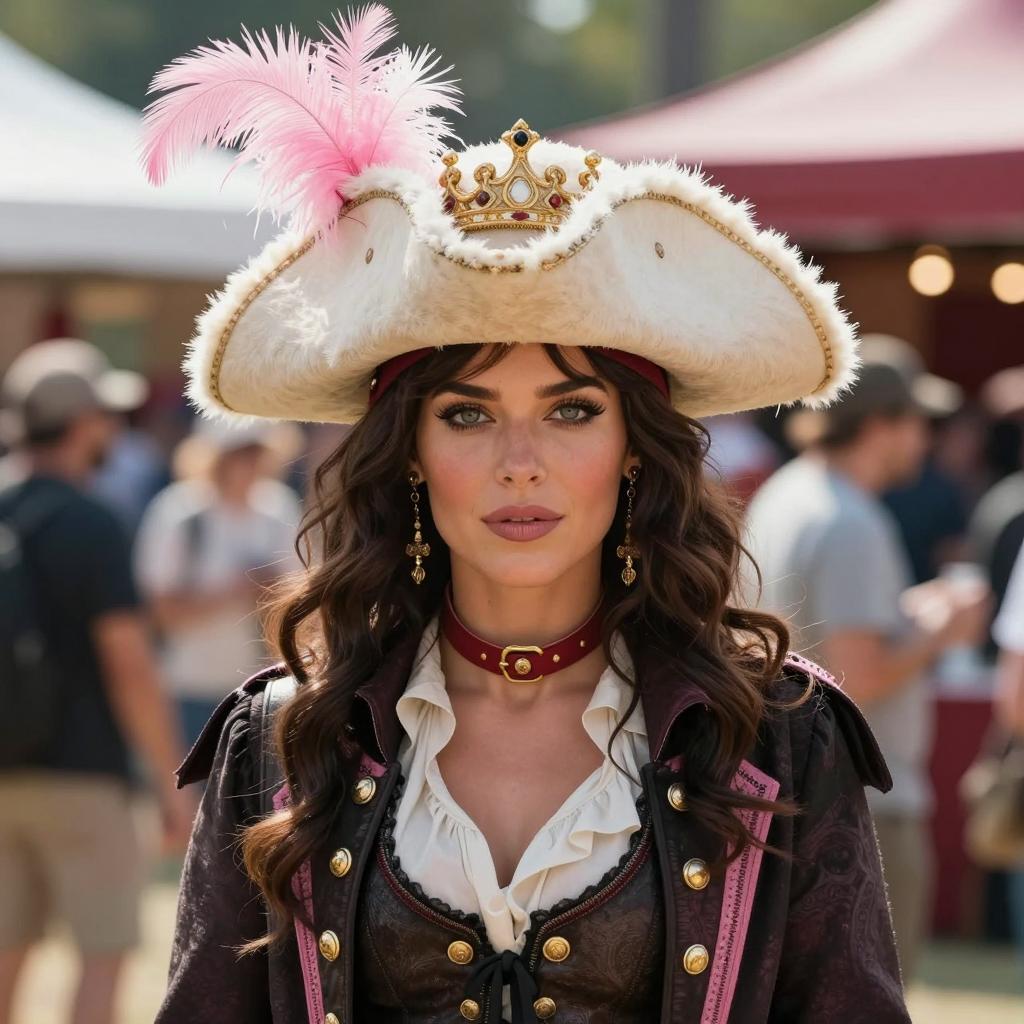 Greatest showman woman, photograph of a woman wearing a pink feathered and white fur pirate hat with a golden crown, dark brown wavy hair, green eyes, black and pink trimmed pirate jacket with gold buttons, white ruffled shirt, red and gold choker, gold earrings, outdoor festival, bright sunlight, blurred background with people and red tents, realistic style, detailed ures, daytime, formal pirate attire, confident expression