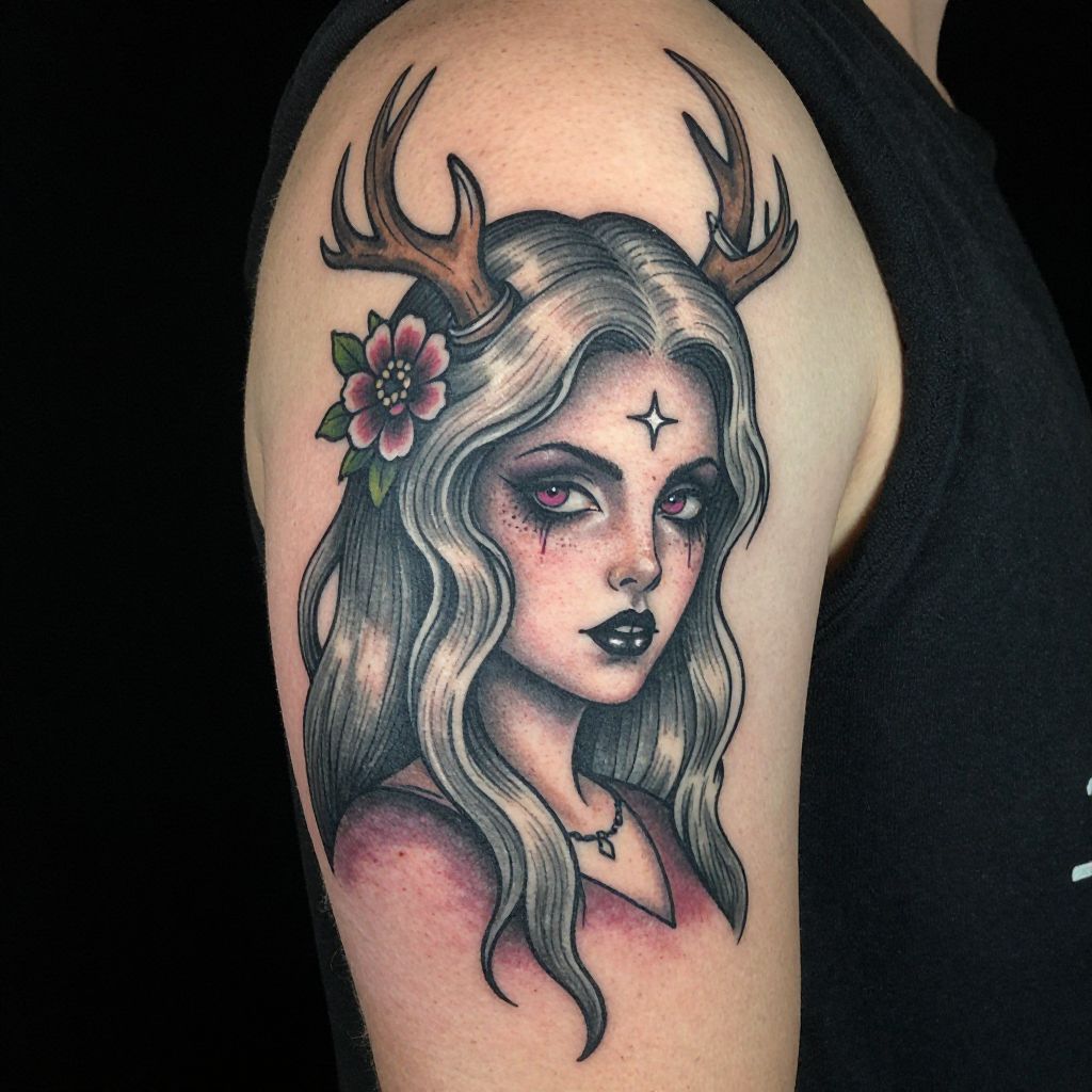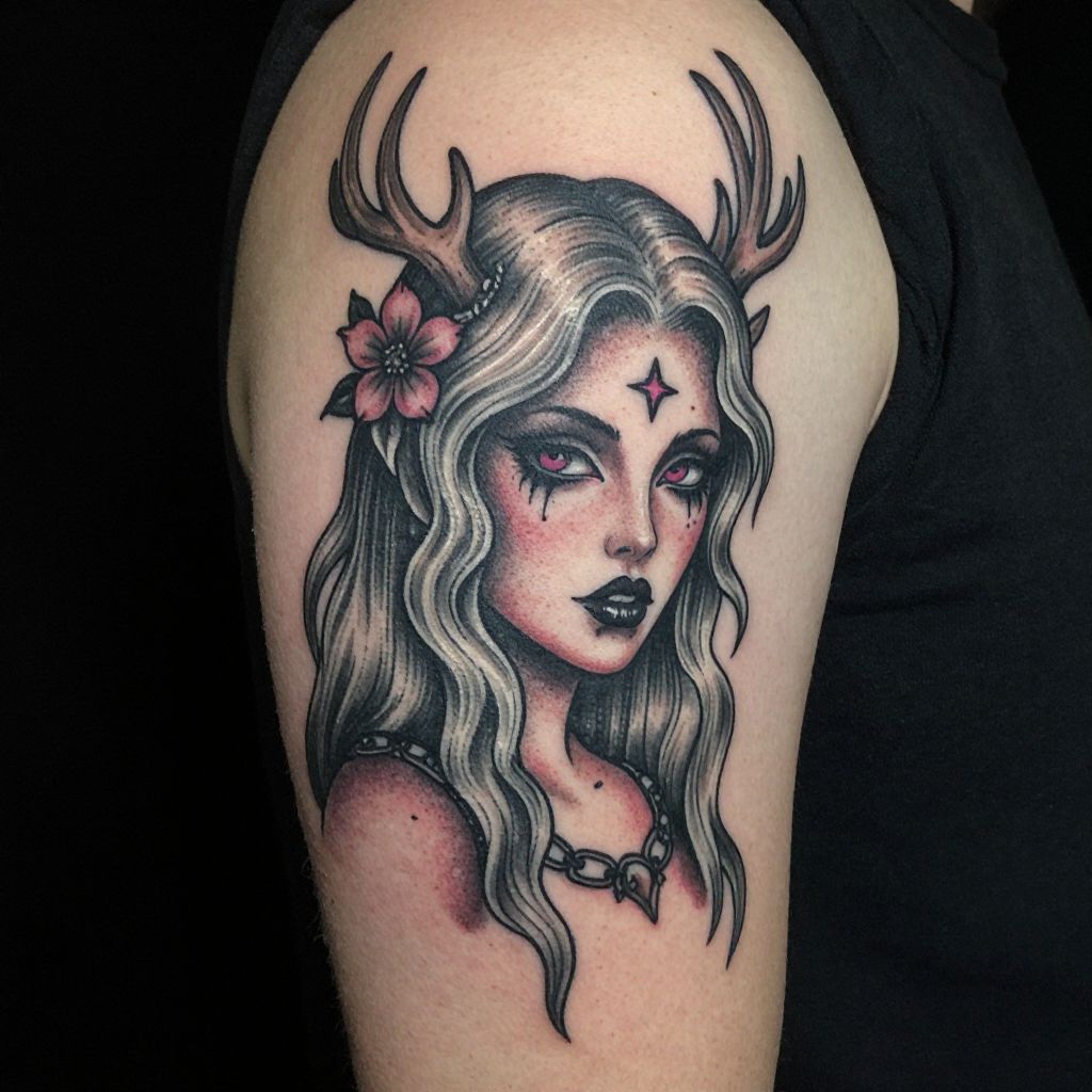 Tattoo of a mystical woman with wavy silver hair, black lips, deer antlers, a pink flower, and a star on her forehead