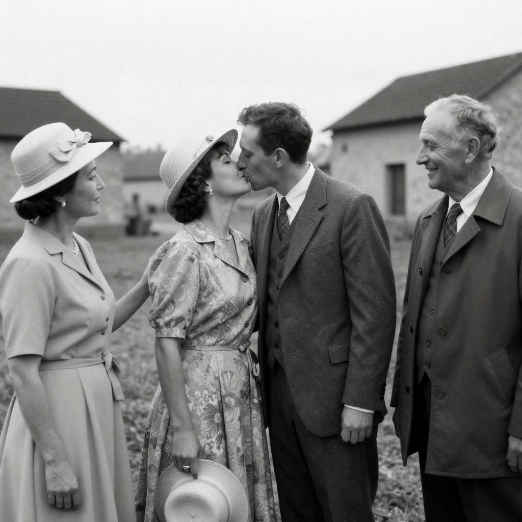 Sepia photograph of five people standing on rocky shore, back to camera. Robert Hillard's family with Edward Joseph and Theda Bara. Robert Hillard and two men in suits, Edward Joseph in dark suit, Theda Bara in long dress, young girl in plaid dress. Overcast sky, rocky terrain. Family group on left, Edward Joseph on right. All standing, facing ocean.