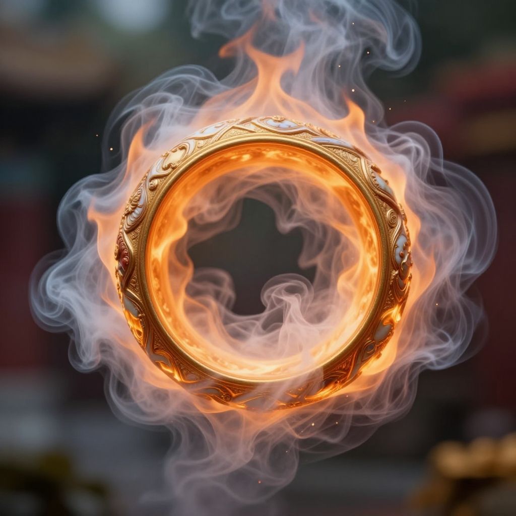 Infinite porcelain fractal golden rings, made of glowing flames. glowing smoke particles in motion. extreme depth of field. volumetric fog and smoke.concept art, perfect composition, masterpiece, professional photography, dynamic natural side lighting, canon lens, shot on dslr 64 megapixels, volumetric fog, sharp focus, ethereal, hyperrealistic, splash art, concept art, intricately detailed, color depth, dramatic, colorful background, depth of field, tilt shift, bokeh.