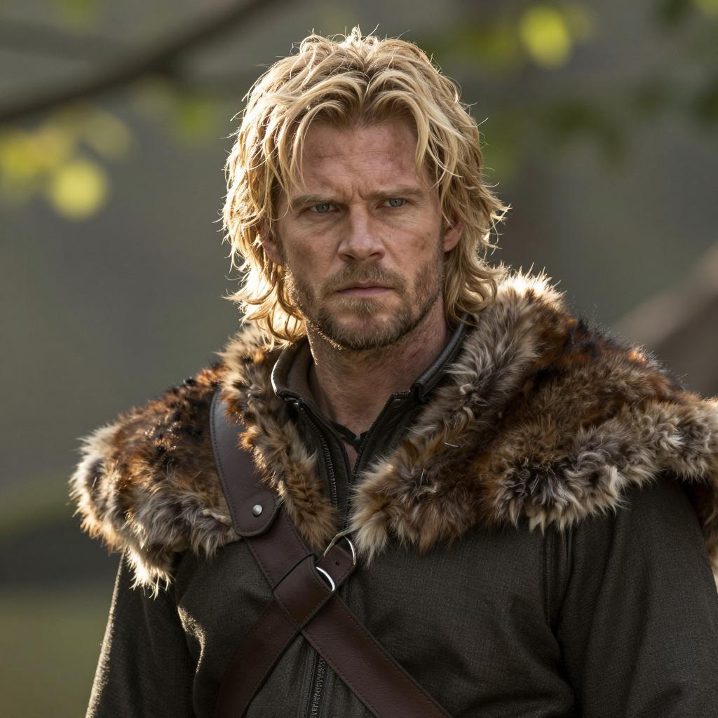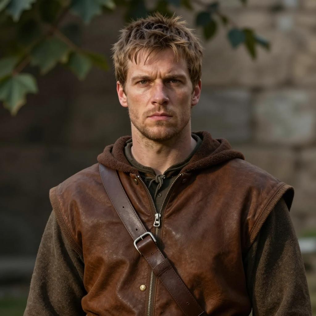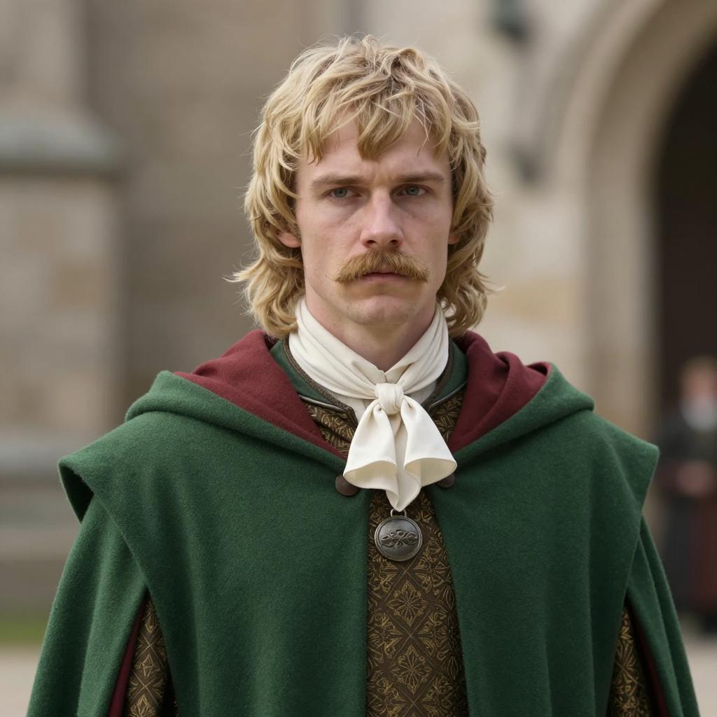 Wizard robe, photograph of middle-aged white man with short blonde hair and light beard, serious expression, wearing dark hooded robe with maroon trim, gray background, studio lighting, upper body shot, realistic, plain background, medium close-up, actor, formal attire, subtle shadows, neutral colors
