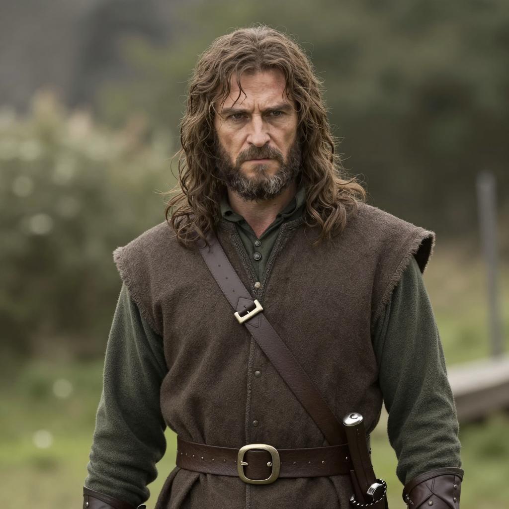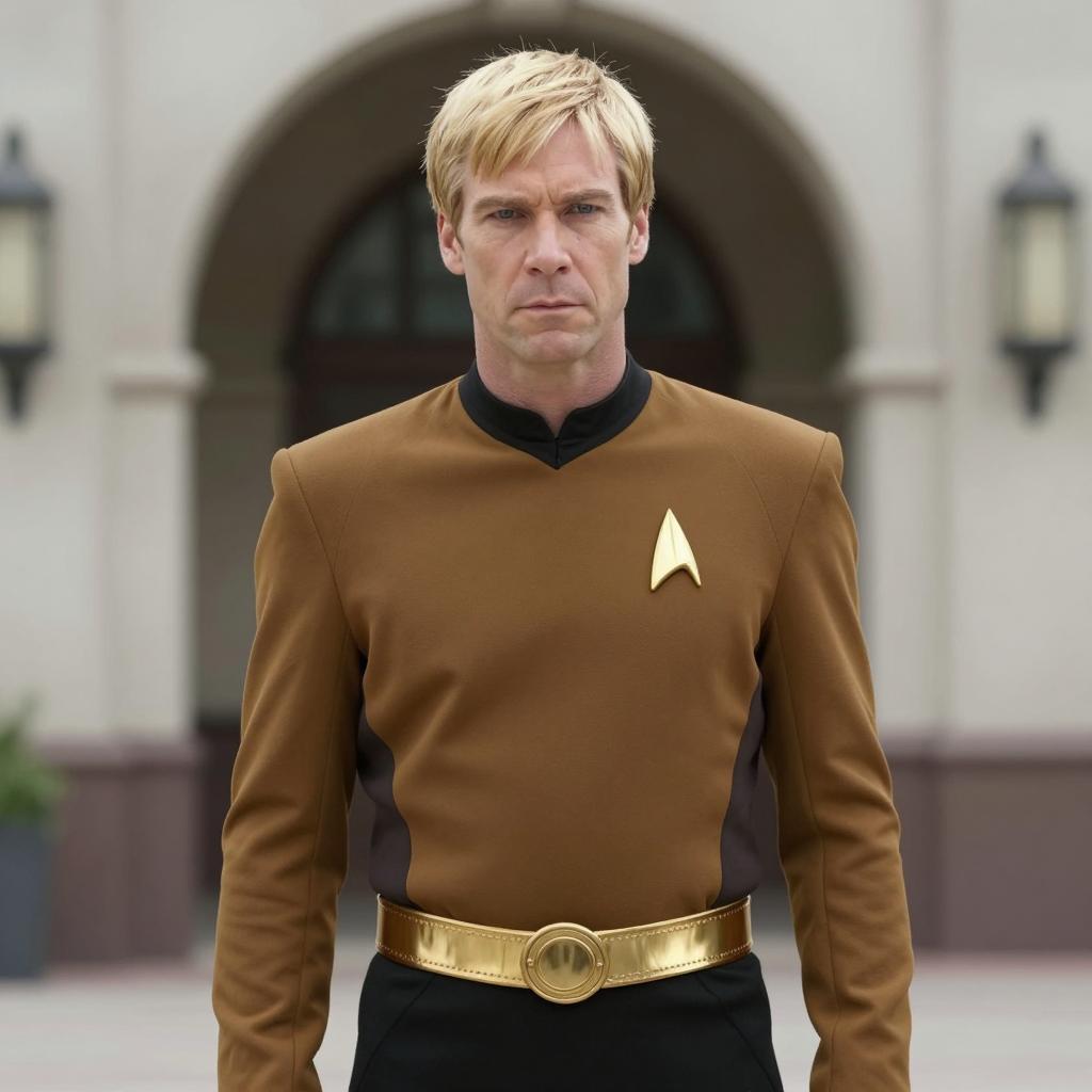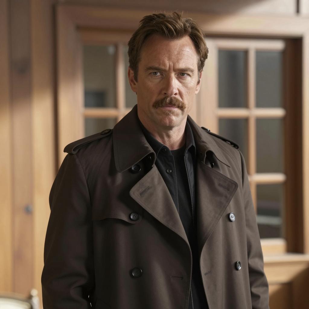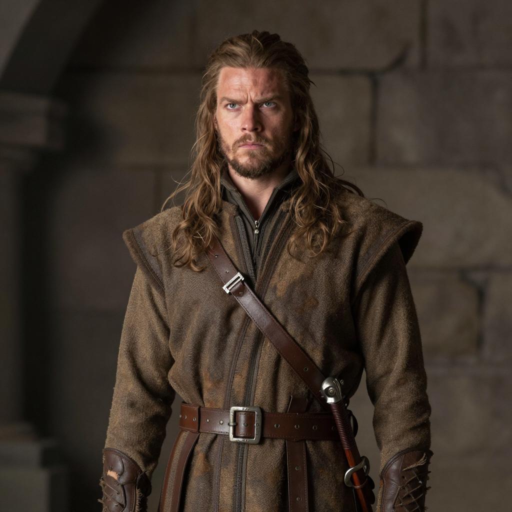 Wizard robe, photograph of middle-aged white man with short blonde hair and light beard, serious expression, wearing dark hooded robe with maroon trim, gray background, studio lighting, upper body shot, realistic, plain background, medium close-up, actor, formal attire, subtle shadows, neutral colors