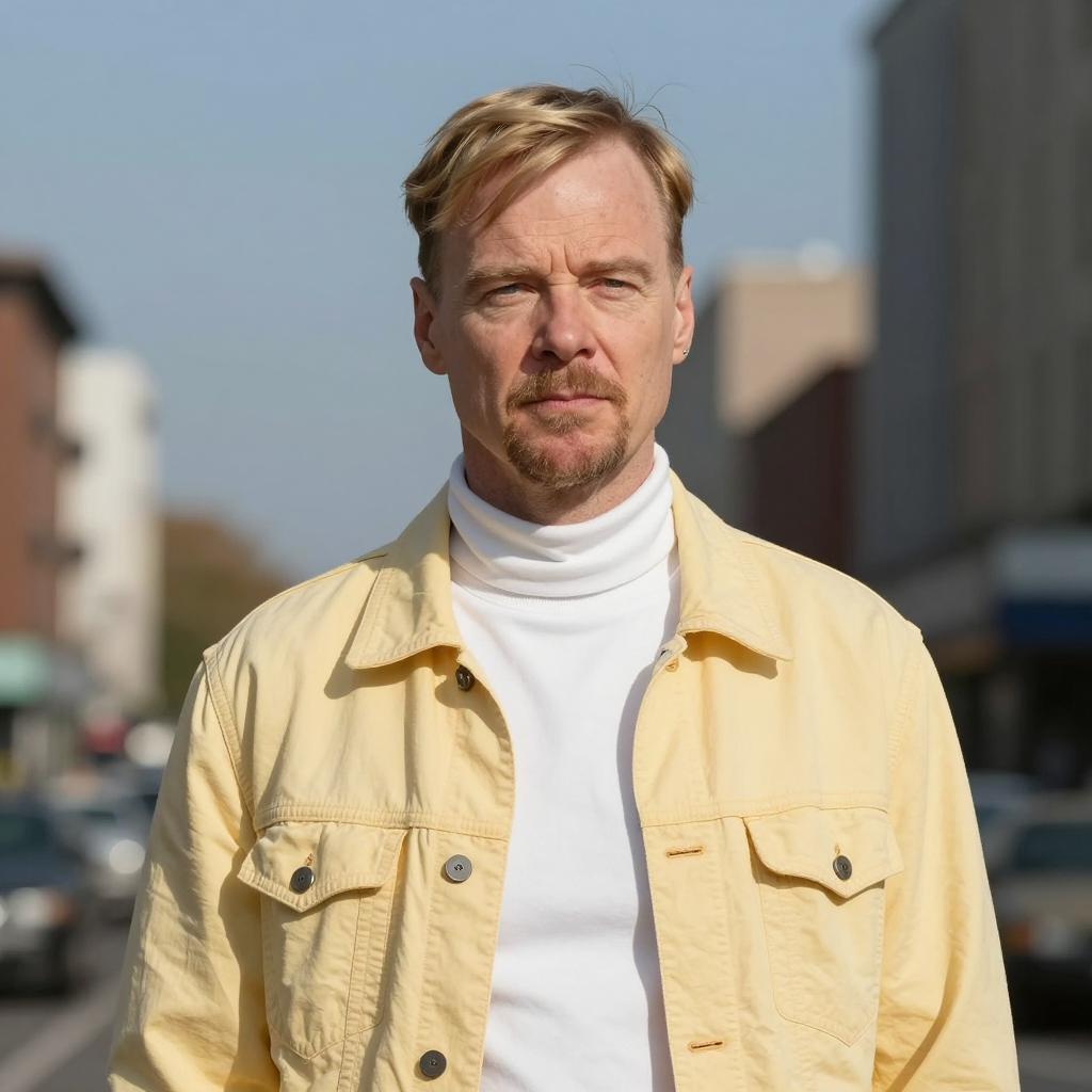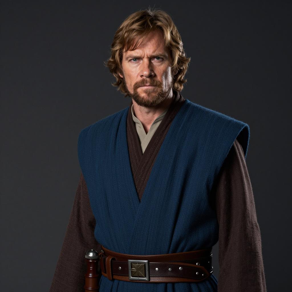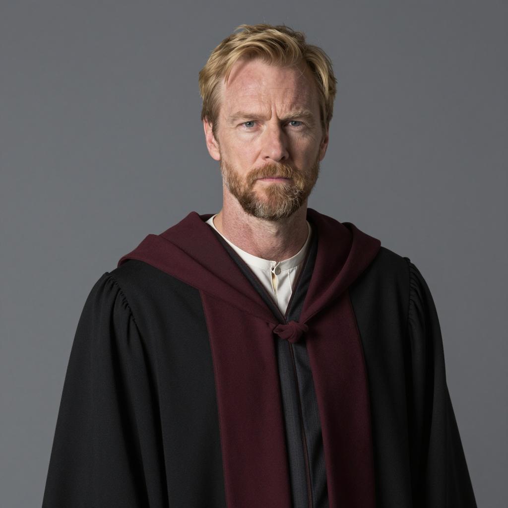 Studio portrait of a middle-aged white man with short blonde hair and a light beard, wearing a dark hooded wizard robe with maroon trim. The man has a serious expression and is photographed against a plain gray background with subtle shadows, focusing on upper body.