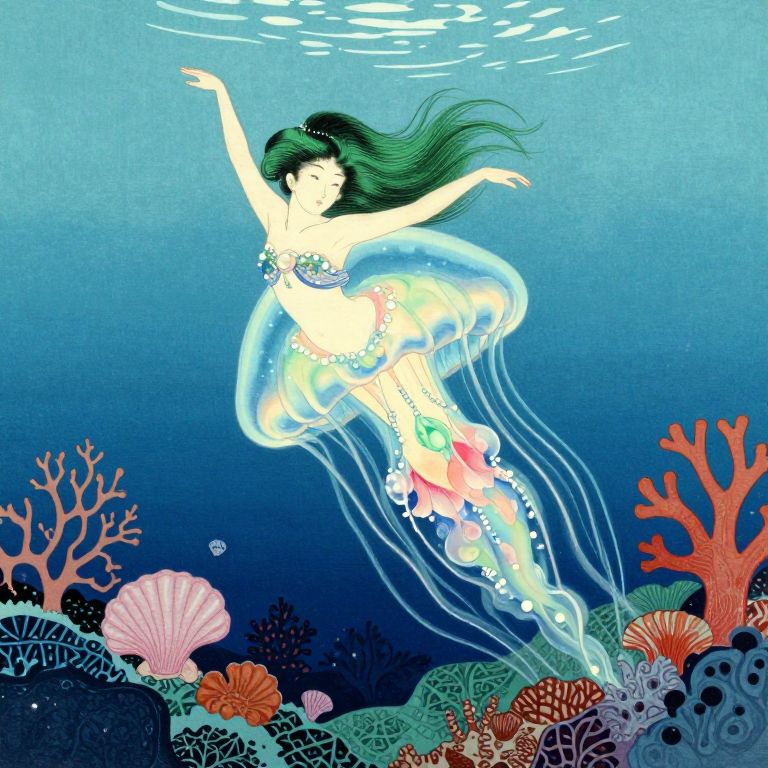 A captivating underwater scene emerges in the enchanting style of Japanese ukiyo-e woodblock prints, where a whimsical sea nymph with cascading green hair gracefully balances on an enormous, luminous jellyfish sphere. As she performs an exquisite pirouette, her dainty shell and pearl adornments shimmer in the sunlight filtering through the pristine ocean waters. The coral reef backdrop thrives with vibrant life and intricate patterns, contrasting the soft, curved forms of the sea nymph and her celestial companion. This imaginative image encapsulates a sense of enchantment and wonder, artfully blending traditional Japanese aesthetics with fantastical marine elements to evoke an emotional response of delight and curiosity.