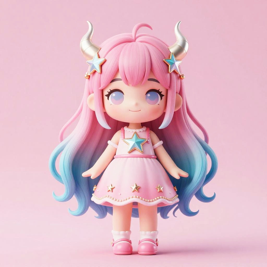 Masterpiece, best quality, 8k, cinematic light, ultra high res, chibi, 1girl, child, pink hair, multicolored hair, long hair, solo, dress, star hair ornament, horns, blue hair, star \, (symbol\), bangs, gradient hair, artist name, gradient, smile, closed mouth, full body, pink background, gradient background