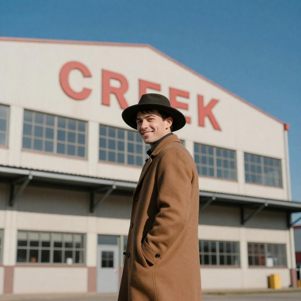 Photograph of a smiling man in a brown coat and black hat, standing in front of a large industrial building with large windows and red letters "CREEK" on the roof. Bright blue sky in background. Man is looking over his shoulder. Industrial building has a weathered appearance with metal beams and windows. Clear, sunny day.