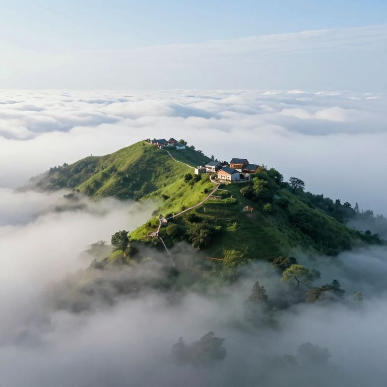 Photograph of a lush green hilltop shrouded in mist, with a cluster of small, rustic houses at the summit. The hill is covered in verdant grass and scattered trees. A winding road curves up the hill from the lower left. The background shows a layer of white, fluffy clouds, partially obscuring the lower parts of the hill. The sky above is clear and blue, adding a serene contrast to the misty landscape. The houses have brown and beige roofs, blending seamlessly with the natural surroundings. The image exudes a peaceful, almost ethereal atmosphere.