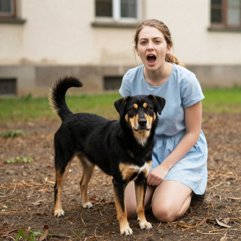 Photograph of a young woman with light brown hair in a white dress, crouching on rocky ground, mouth open in a scream. A black and white dog stands beside her, looking forward. Background: beige building with multiple windows. Ground is uneven with scattered rocks and grass. Woman's expression is intense, eyes closed, mouth open. Dog's expression is neutral. Both positioned in the center, with building in the background.