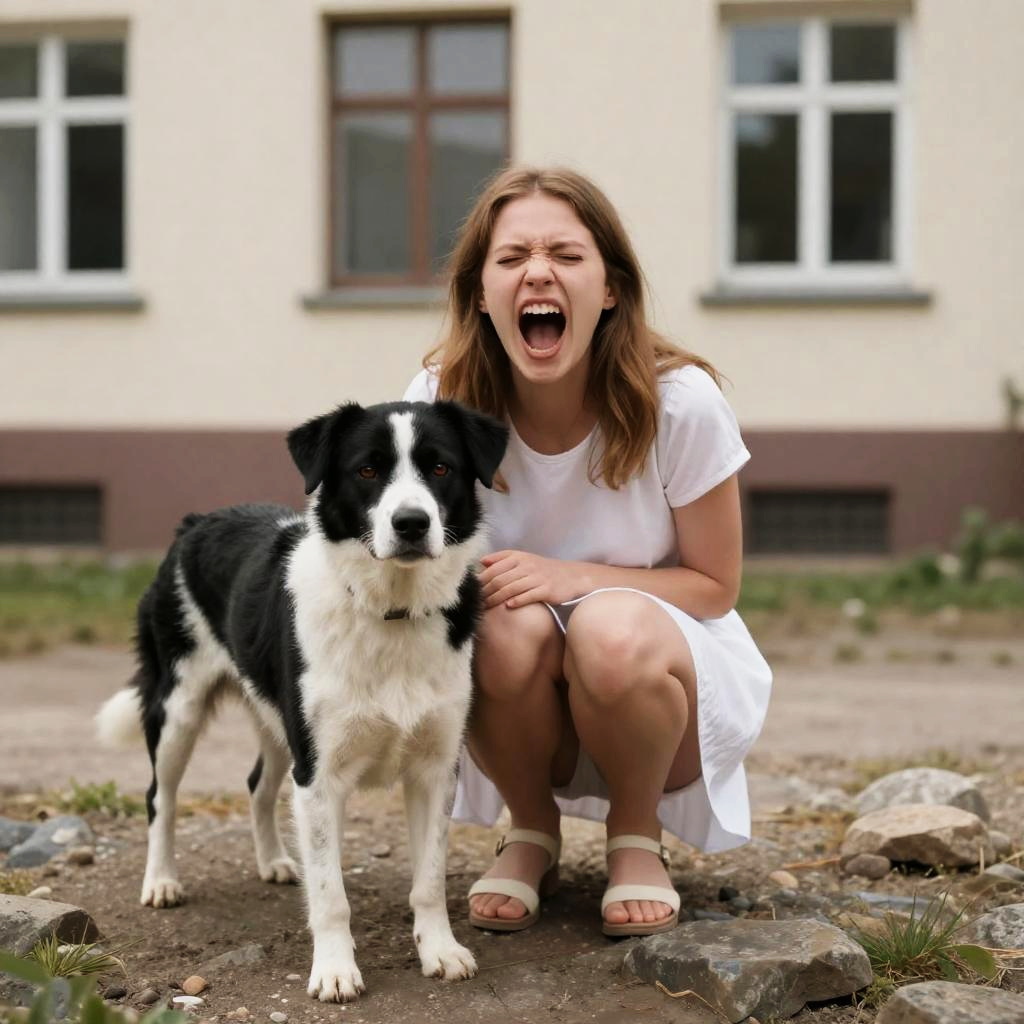 Photograph of a young woman with light brown hair wearing a white dress, crouching on rocky ground with her mouth open in a scream and eyes closed. Beside her stands a black and white dog looking forward with a neutral expression. The background features a beige building with multiple windows and uneven ground with scattered rocks and patches of grass.