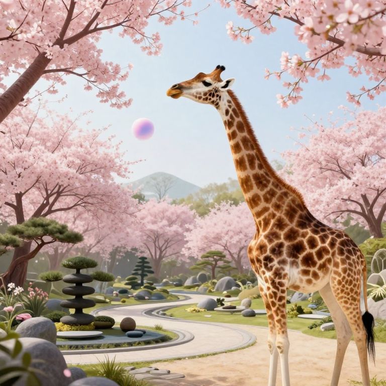 Digital artwork of a giraffe standing on a fluffy cloud, surrounded by futuristic, ornate, dome-like buildings in a bright, sunlit sky.
