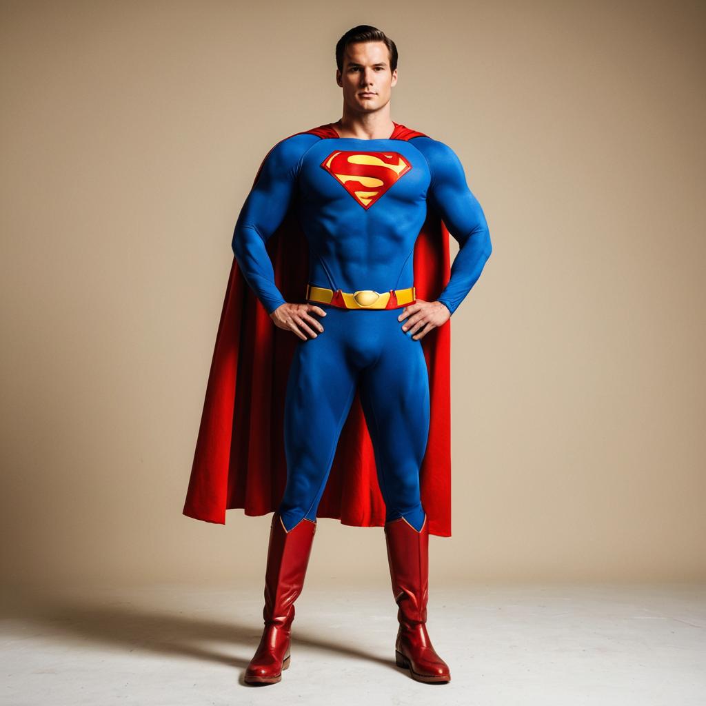 Funny superhero outfit, photograph of young man, standing in empty room, wearing Batman costume, blue and red suit, yellow Batman on chest, red cape, red gloves, black belt with gold star, black cowl mask, short brown hair, light skin, neutral expression, soft lighting, blurred background, modern interior, realistic, casual, superhero costume, daytime, centered subject
