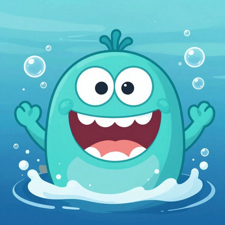 A cheerful, turquoise water monster with two antennae and a wide, toothy grin, emerging from the water with bubbles around it.