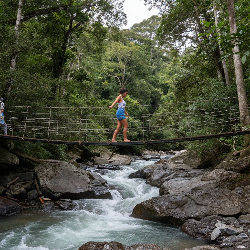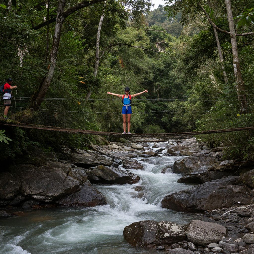 Photograph of a woman in a white tank top and blue shorts crossing a suspended rope bridge over a rocky, rushing river in a dense, green forest