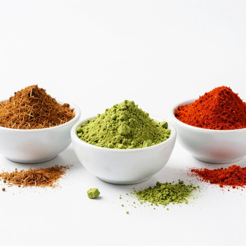 Photograph of three white ceramic bowls filled with different spices. The bowl on the left is overflowing with brown paprika powder, the middle bowl is packed with bright green matcha powder, and the right bowl is brimming with vibrant red chili powder. Spices spill out onto the white background, creating a colorful and textured display.