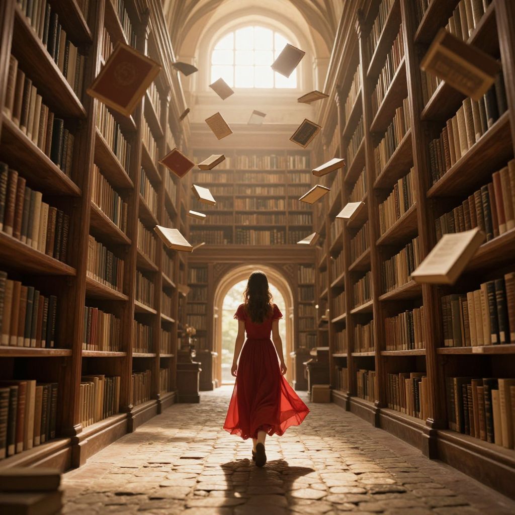 Digital art depicting a woman with long, wavy brown hair, wearing a flowing red dress, walking down a grand, dimly-lit library aisle. The aisle is flanked by tall, wooden bookshelves filled with books, and books are mid-air, floating towards the ceiling. The floor is cobblestone, and the ceiling features an arched, sunlit window at the far end. The woman's back is to the viewer, and she is centered in the image, creating a sense of mystery and adventure. The lighting is soft, with a warm, golden glow.